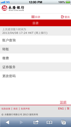 成功登入手机银行后将显示主目录。