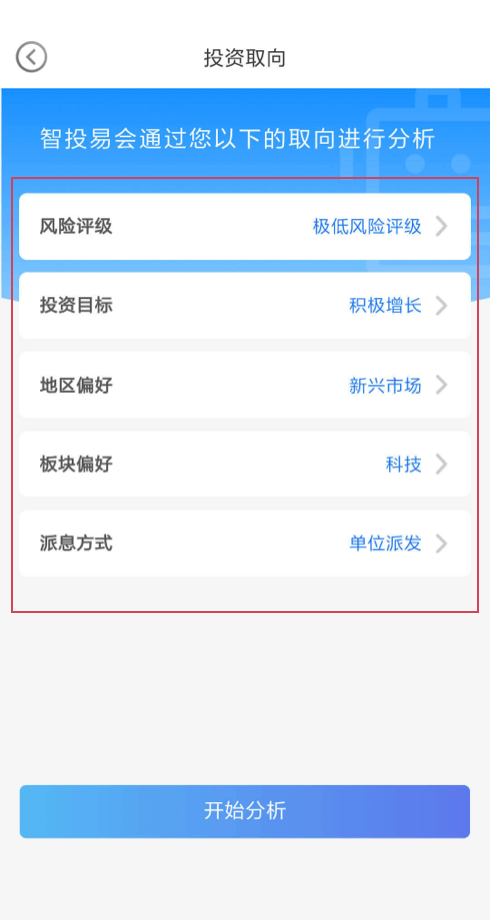 「智投易」会根据您所选择的投资取向进行分析,推荐合适的基金组合。