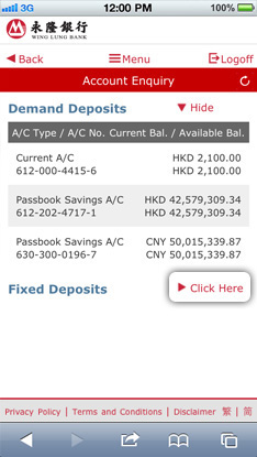 You can view your overall accounts balances. You can also press “Click Here” to show account balance or press “Hide” to hidden.