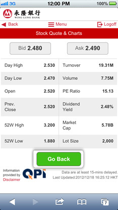 The lower part of the page will show the enquired stock information. Then press “back” in the menu bar or “Go Back” at the bottom page to back to the previous page.