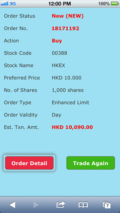You can check the order detail or place an order again by pressing “Order Detail” and “Trade Again” respectively.