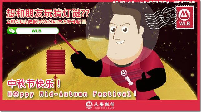 中秋节将至,「WLB」在WeChat平台上准备了多张节日祝福贴图,供粉丝下载及传送给亲友作节日祝福。此外,即日至中秋节,「WLB」更会不定期发送灯谜,让粉丝们猜灯谜迎中秋。