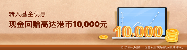 - 在每段优惠期内,每名合资格客户转入基金之市场价值(「转入基金市值」)每累积达港币100,000元,可获港币200元现金回赠;转入基金市值累积达港币1,000,000元或以上,可获额外港币500元现金回赠。每名合资格客户于每段优惠期内最高可享港币10,000元现金回赠。