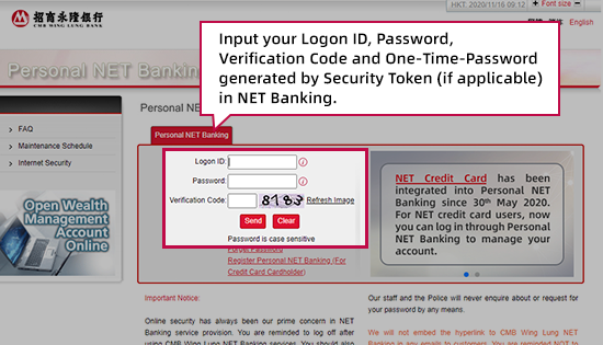 Input your Logon ID, Password, Verification Code and One-Time-Password generated by Security Token (if applicable) in NET Banking.