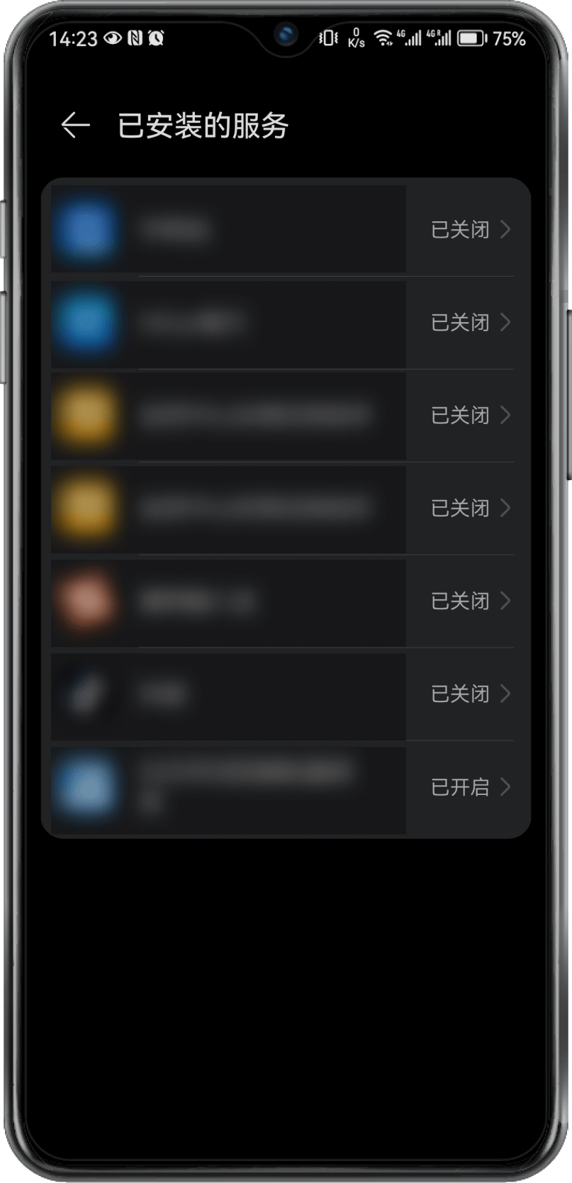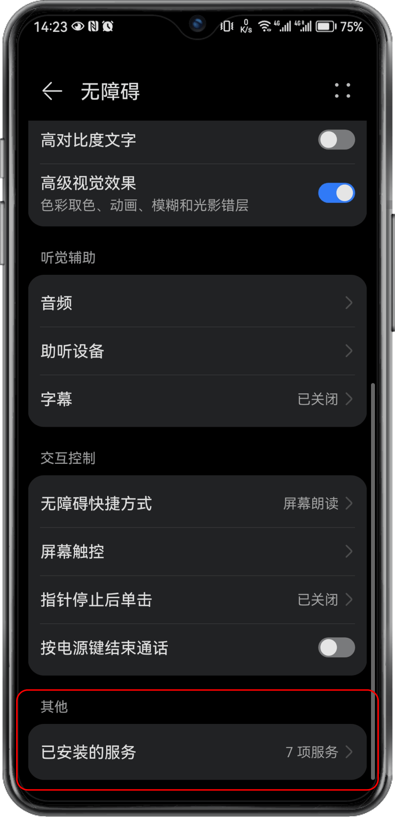 进入「设定」后,选择「无障碍」(部分机型将此选项置于「辅助工具」内),再下滑到最底部的「其他」,选择「已安装的服务」: