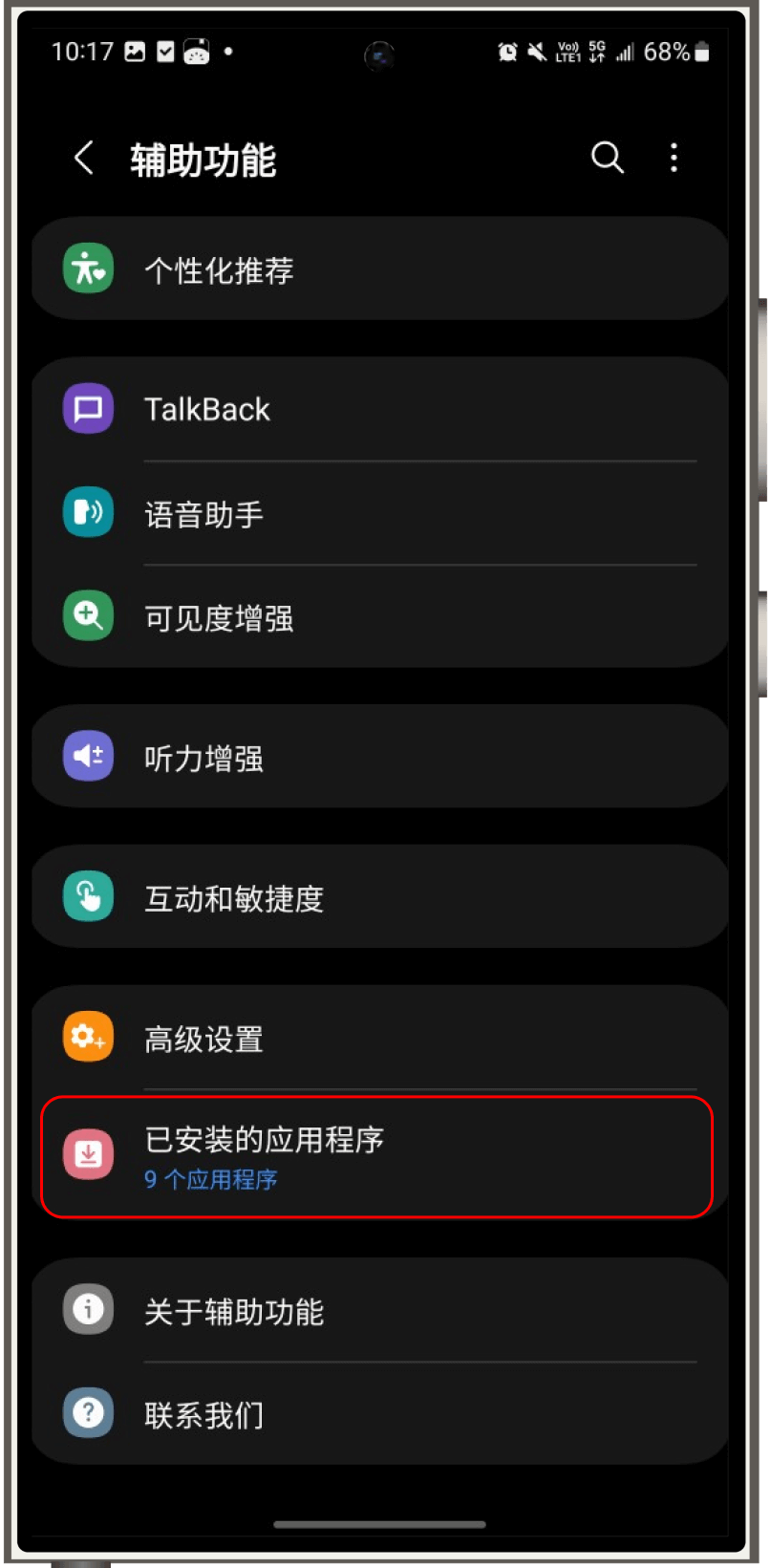 进入「设定」后,选择「辅助功能」 > 「已安装的应用程序」: